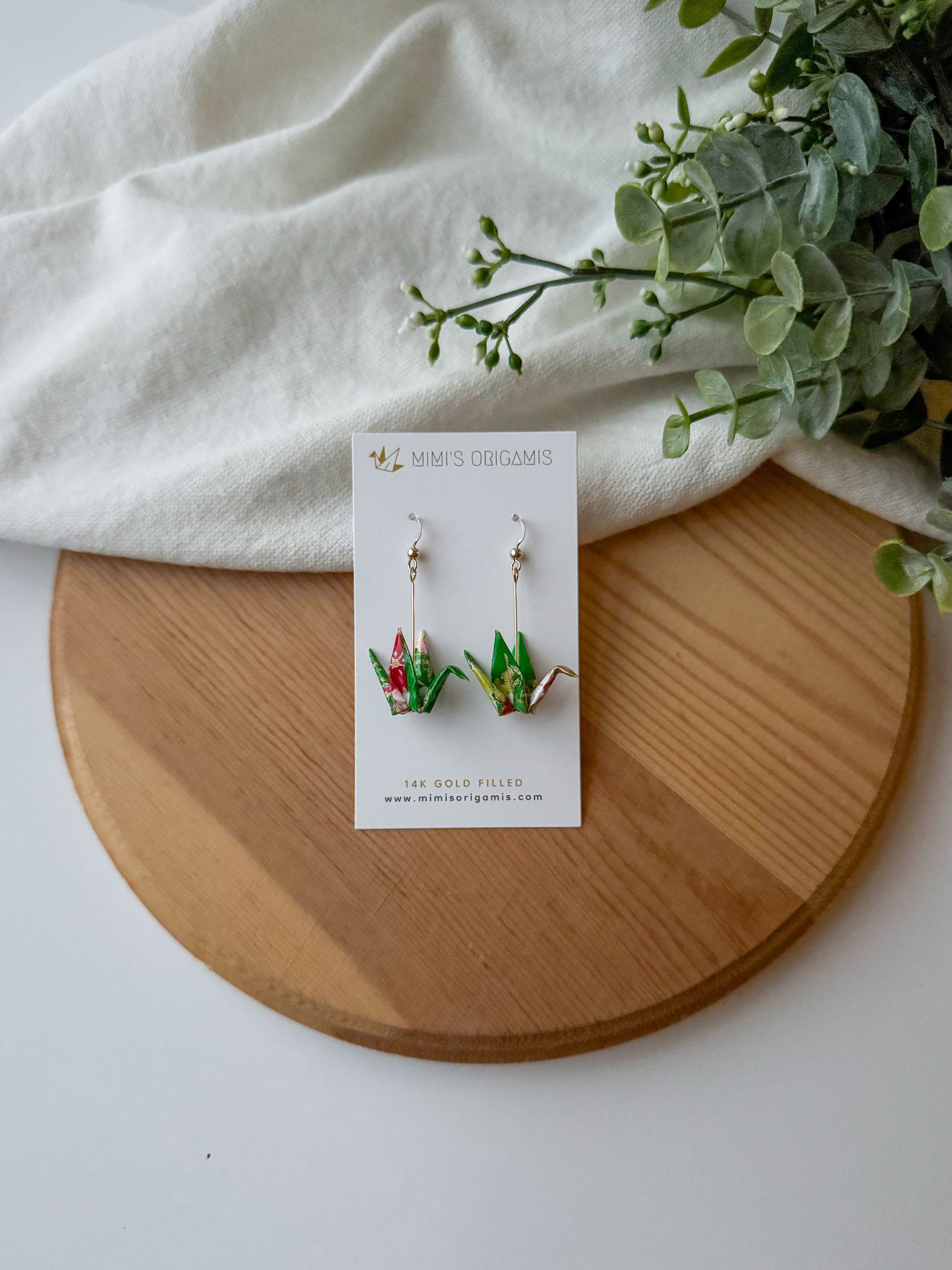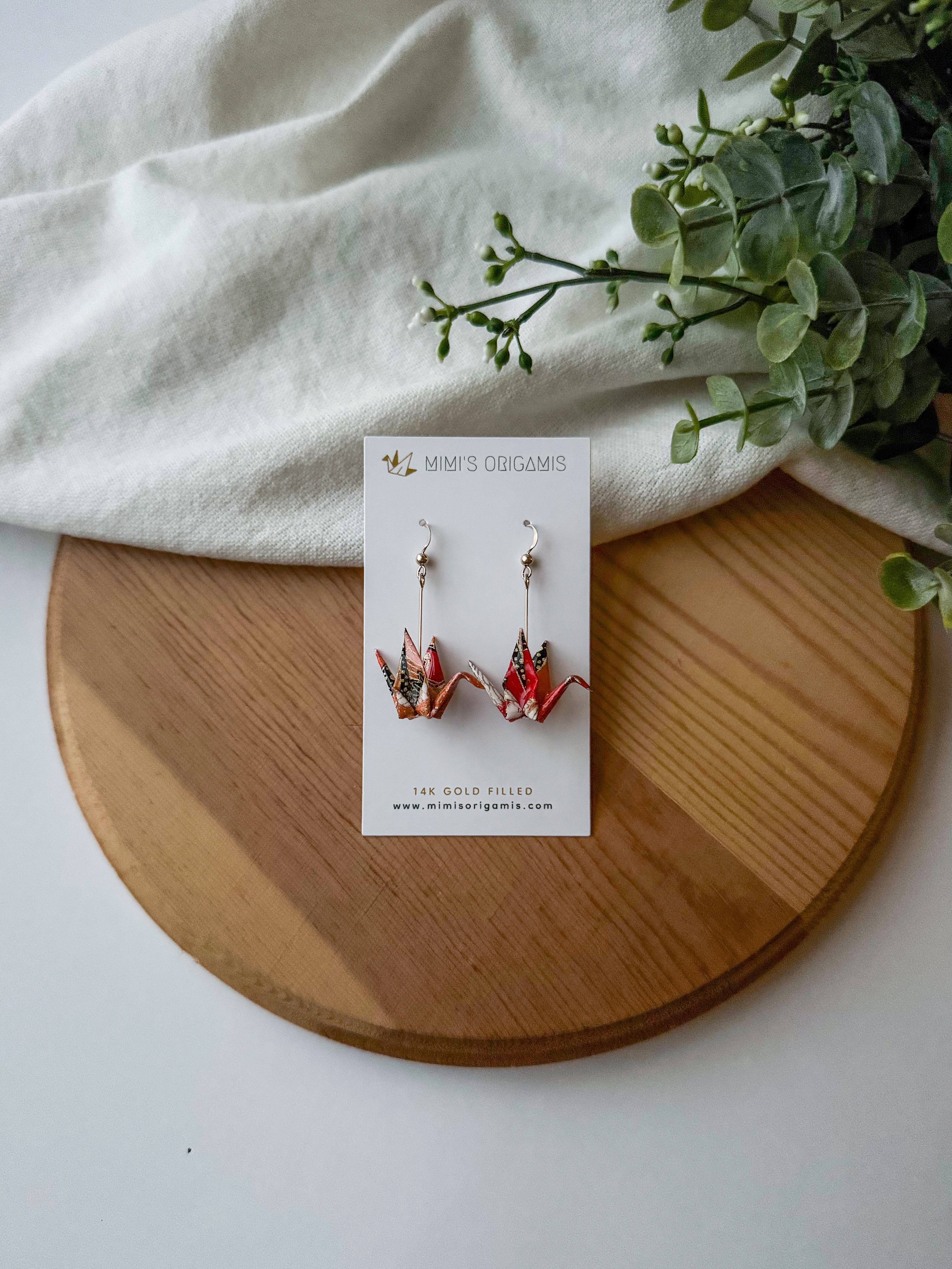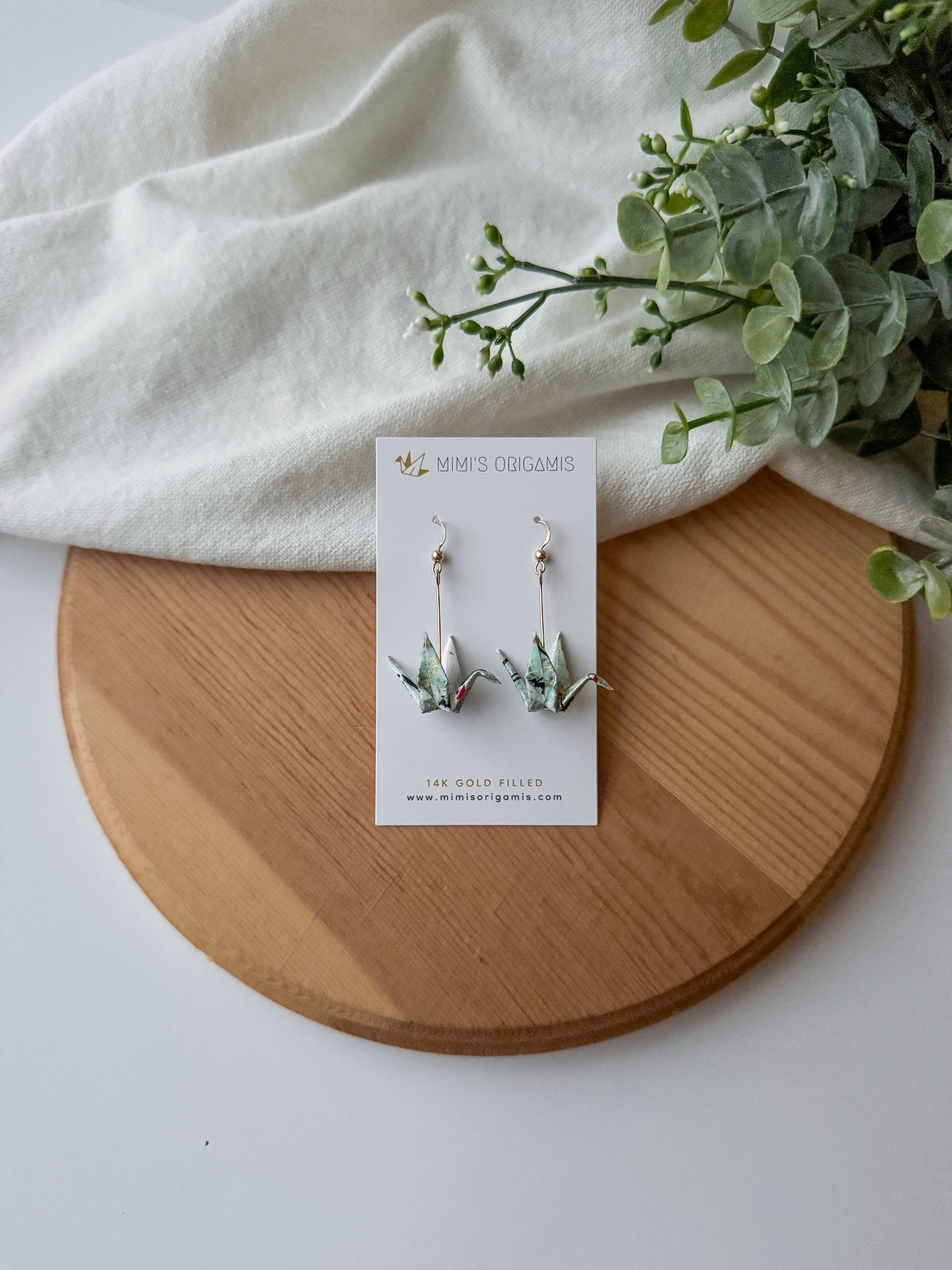 These graceful and elegant origami cranes are handmade with high-quality Japanese washi paper and 14K gold-filled findings. Cranes represent good fortune, longevity, and peace in Japanese culture, so each pair is created with hopes to spread good fortune to the wearer.