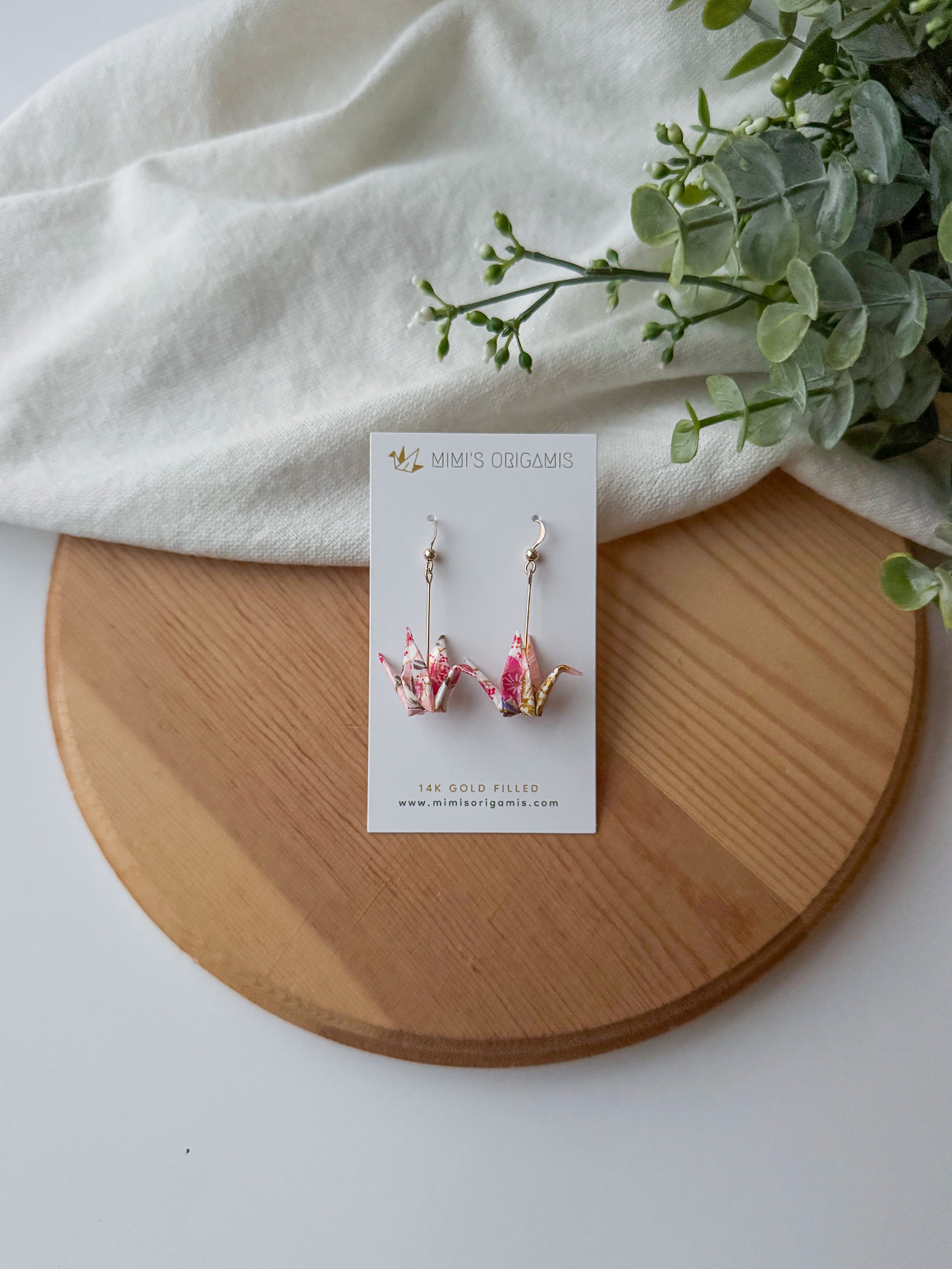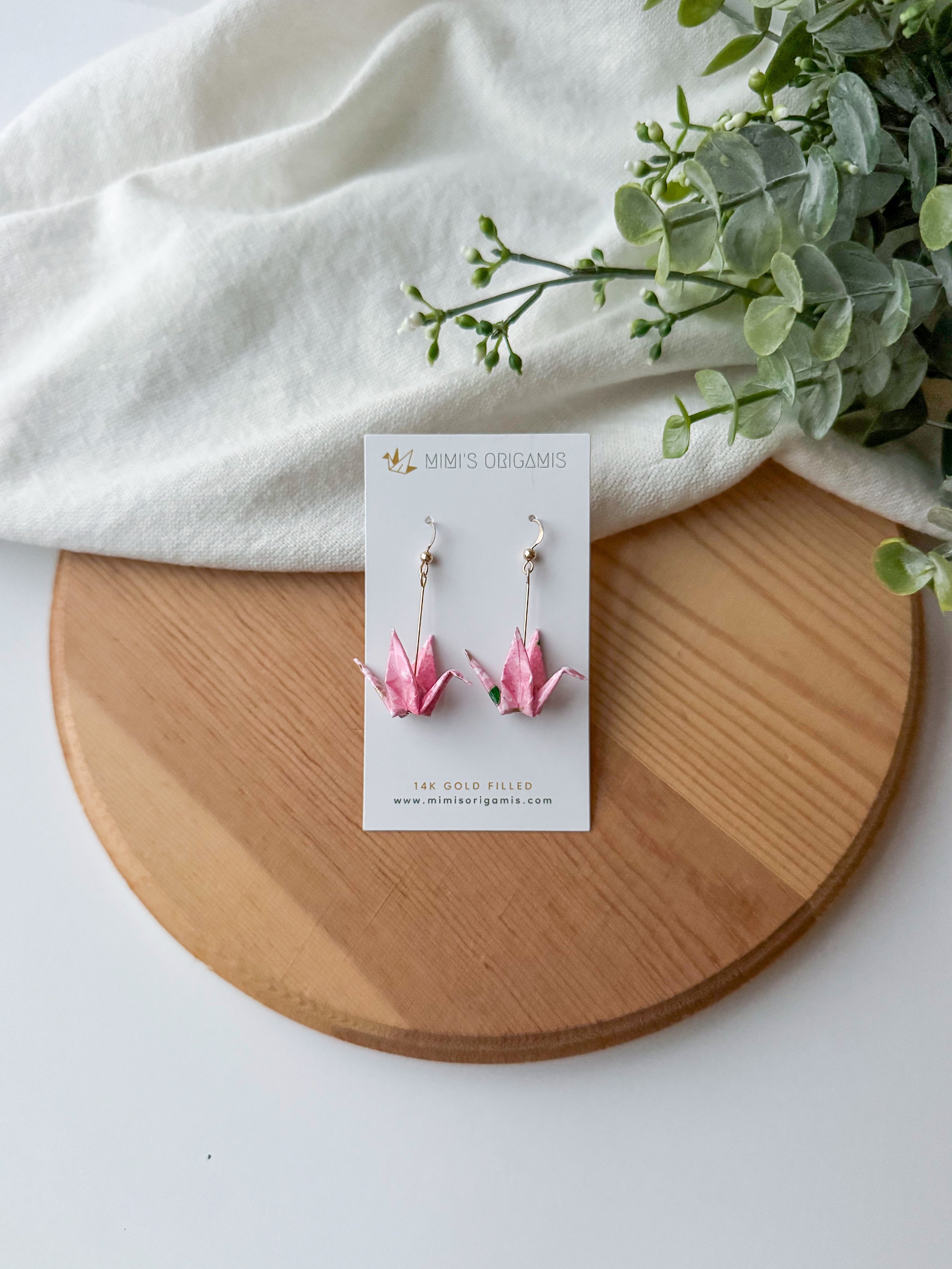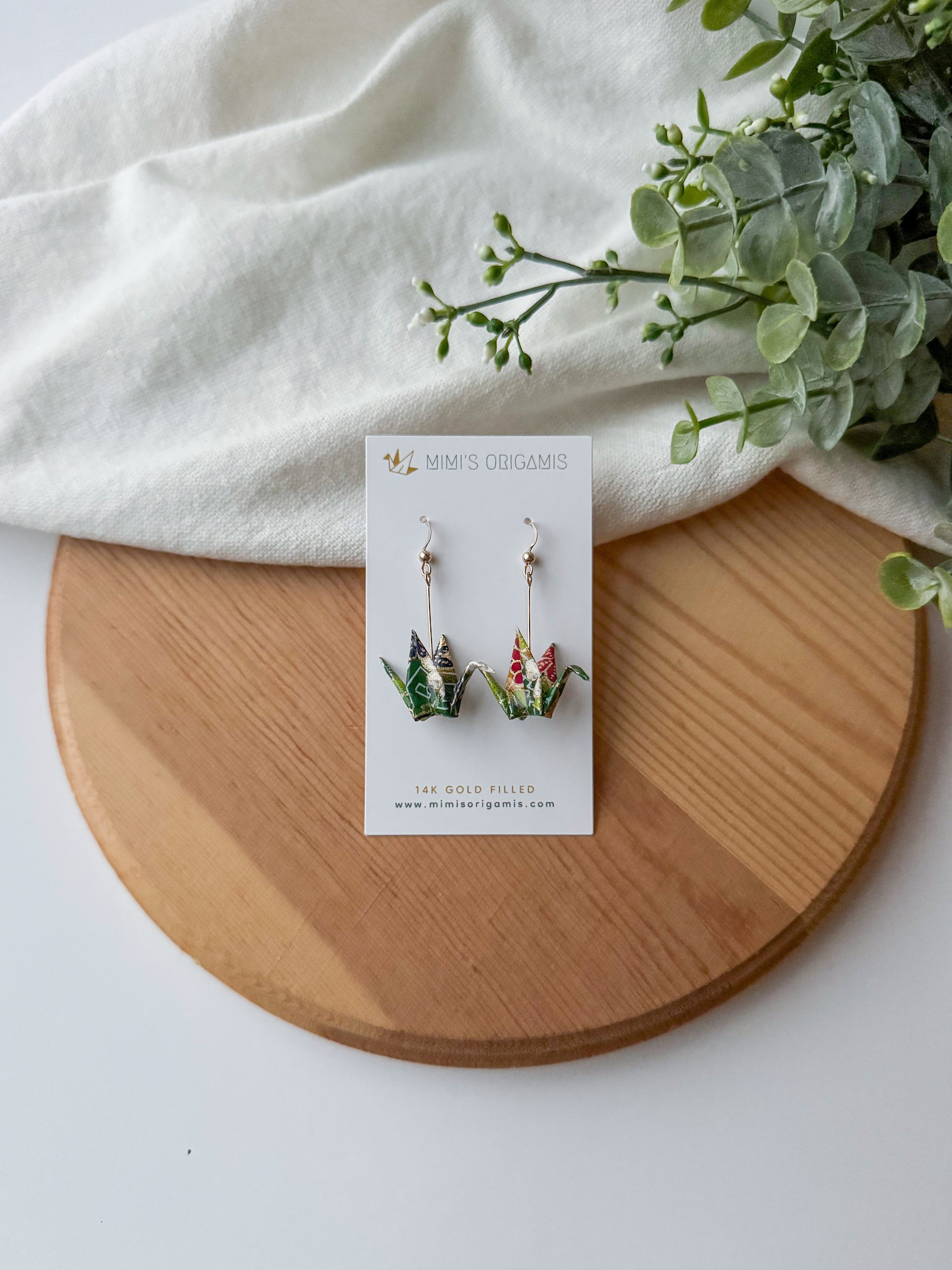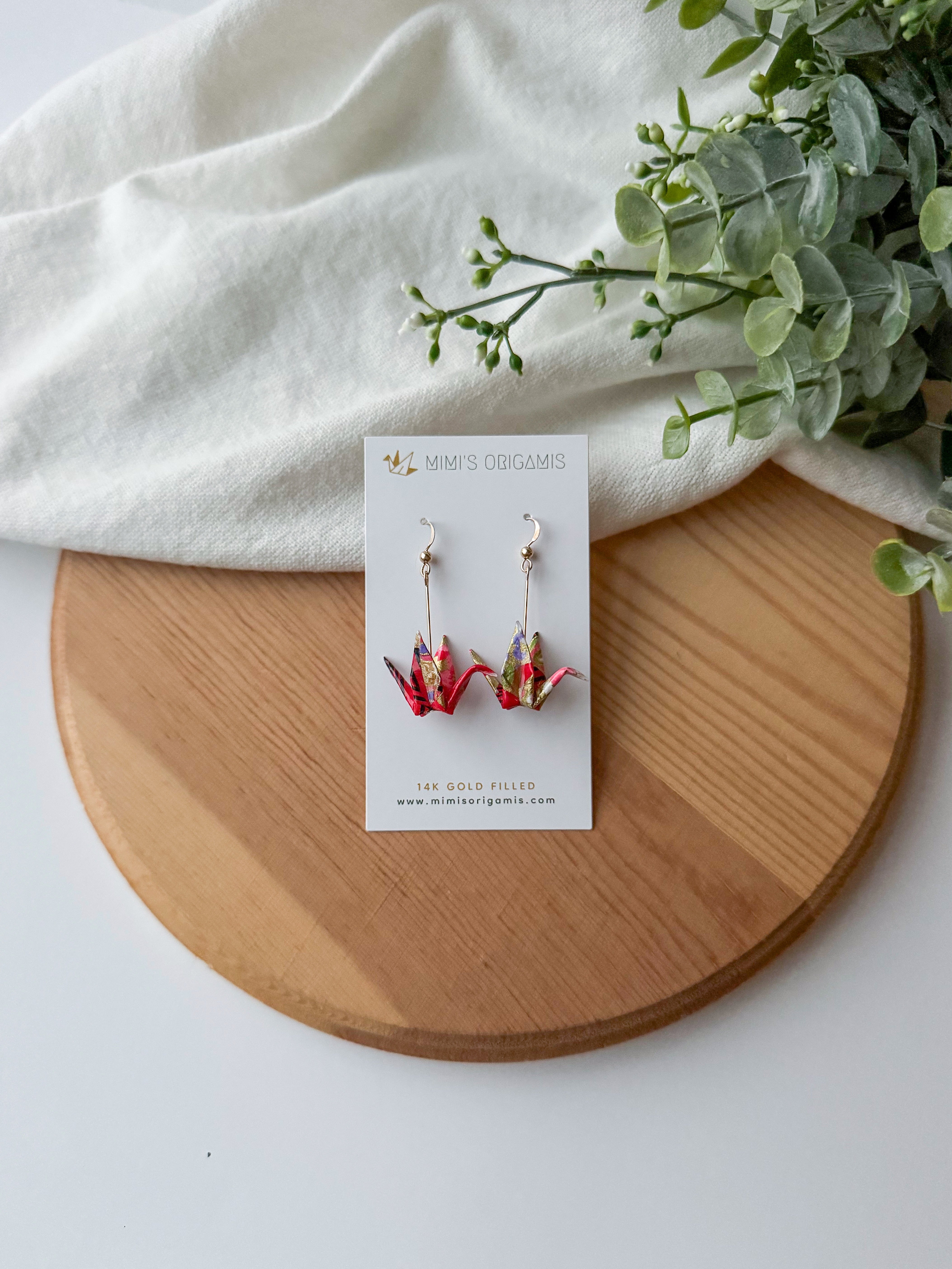 These graceful and elegant origami cranes are handmade with high-quality Japanese washi paper and 14K gold-filled findings. Cranes represent good fortune, longevity, and peace in Japanese culture, so each pair is created with hopes to spread good fortune to the wearer.